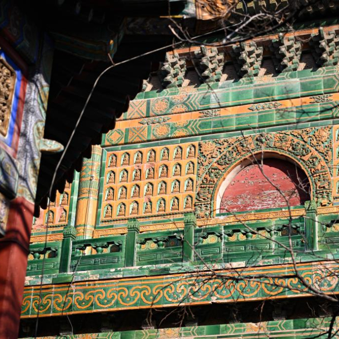 这是1月22日拍摄的三覆檐歇山琉璃阁外立面上的无量寿佛琉璃像。