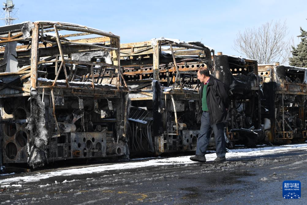 1月21日,在伊朗首都德黑兰,一名男子走过在近期骚乱中被烧毁的公交车。