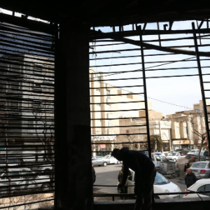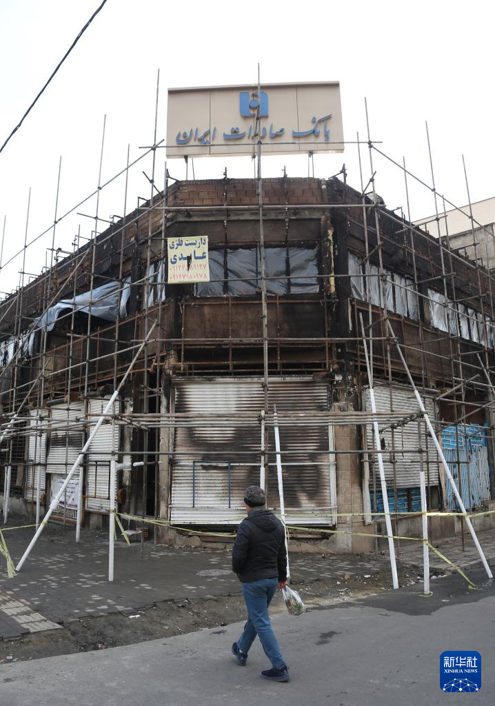 1月21日,在伊朗首都德黑兰,一名男子走过在近期骚乱事件中受损的银行。