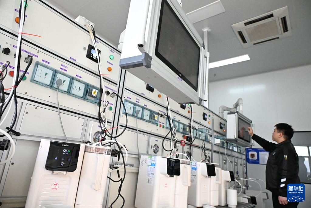 海尔青岛净水互联工厂整机可靠性实验室,工作人员在开展产品高强度耐用试验(1月21日摄)。