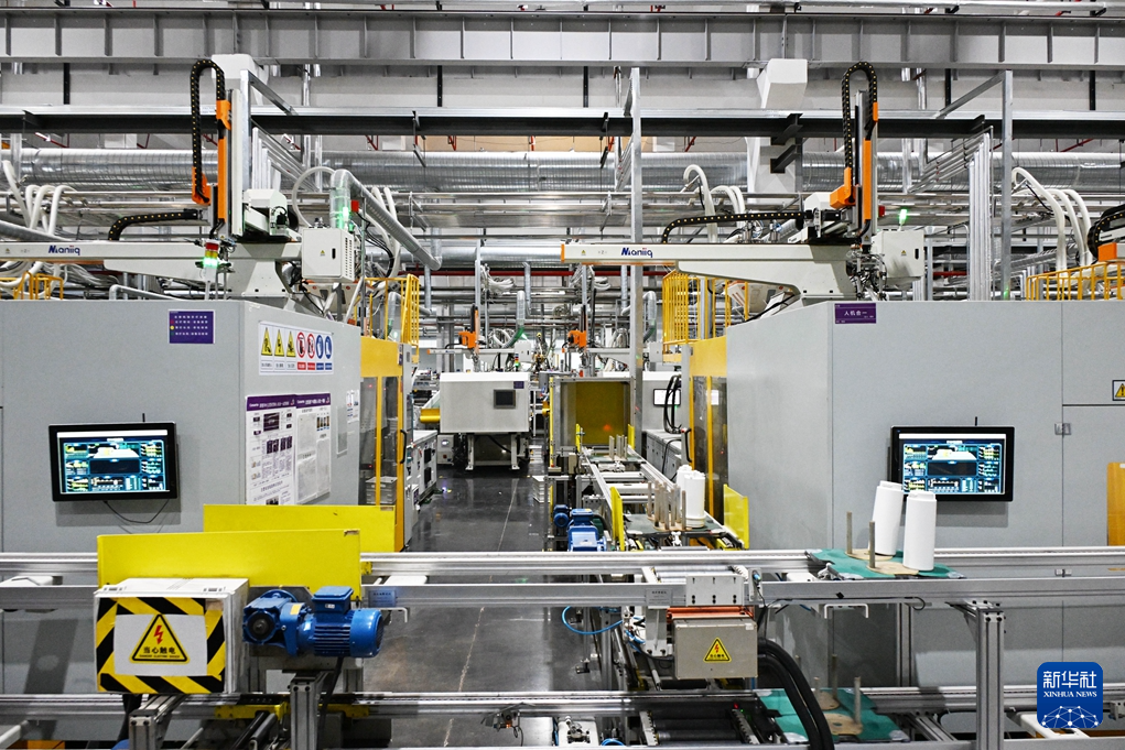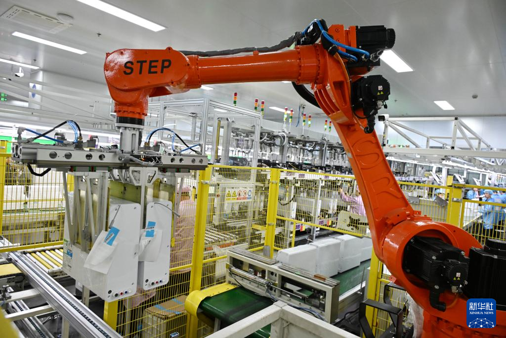 海尔青岛净水互联工厂生产线上,工业机器人在传送产品(1月21日摄)。