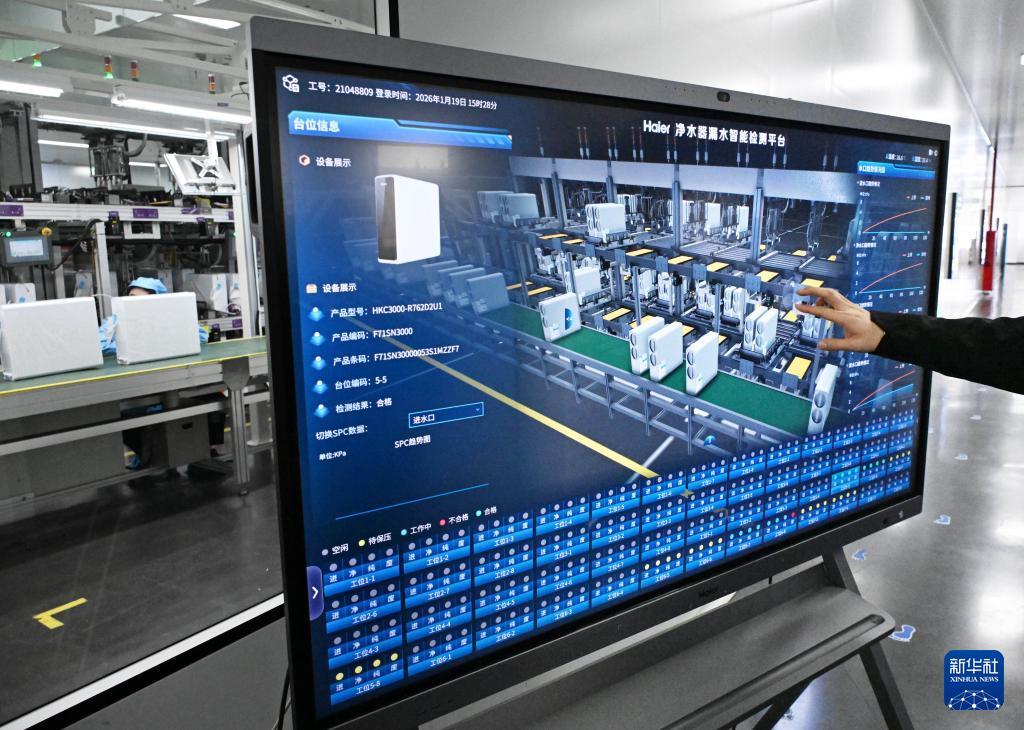 这是1月21日拍摄的海尔青岛净水互联工厂产品漏水智能检测平台。平台可对产品自动监测并锁定缺陷。