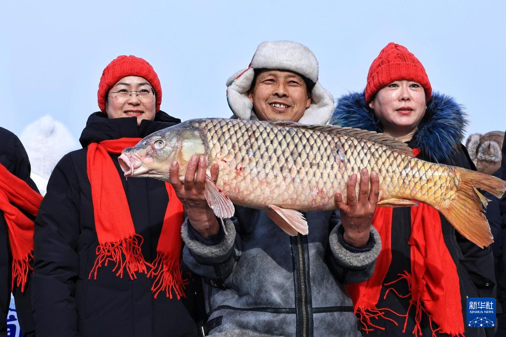 1月23日,在街津口赫哲族乡冬捕活动现场,赫哲族男子(中)捧起捕获的大鱼。