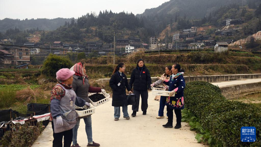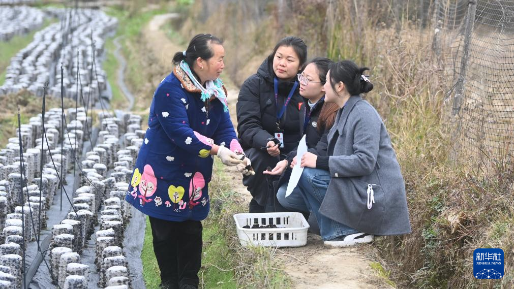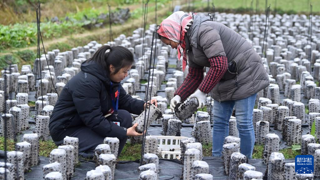 1月23日,在三江侗族自治县八江镇八斗村,基层干部吴晓洁(左)帮村民采收木耳的同时了解项目落实情况。