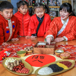 1月23日,在江苏省扬州市九龙幼儿园,老师在教小朋友认识制作腊八粥的食材。