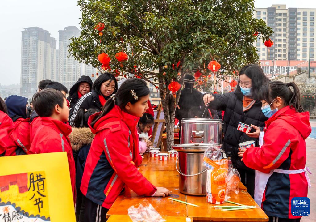 1月23日,学生和家长在贵州省黔西市惠风学校“迎腊八品民俗”文化节活动中品尝腊八粥。