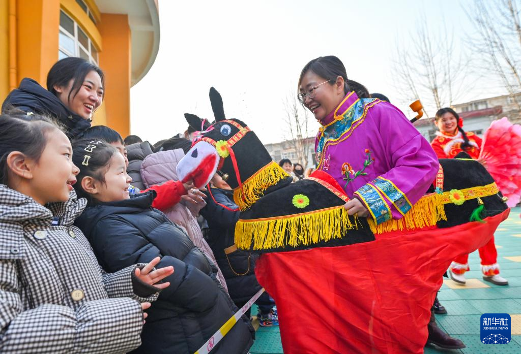 1月23日,在河北省石家庄市第三幼儿园举办的“多彩民俗迎腊八”主题活动中,小朋友体验传统民俗。