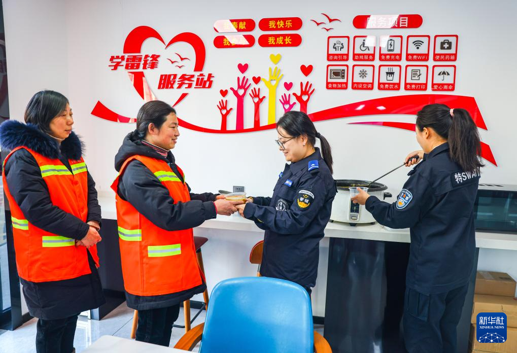1月24日,在江苏省扬州市公安局江都分局仙城警务工作站爱心驿站,驿站志愿者为环卫工人分发腊八粥。
