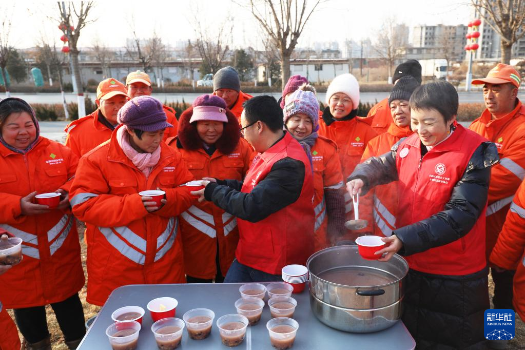 1月24日,在河北省唐山市丰润区街头,志愿者为环卫工人送上腊八粥。