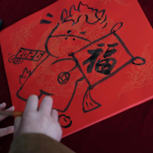 1月24日,书法爱好者在浙江金华铁路枢纽扩容改造工程3标项目部一工区产业工人社区为建设者书写春联。