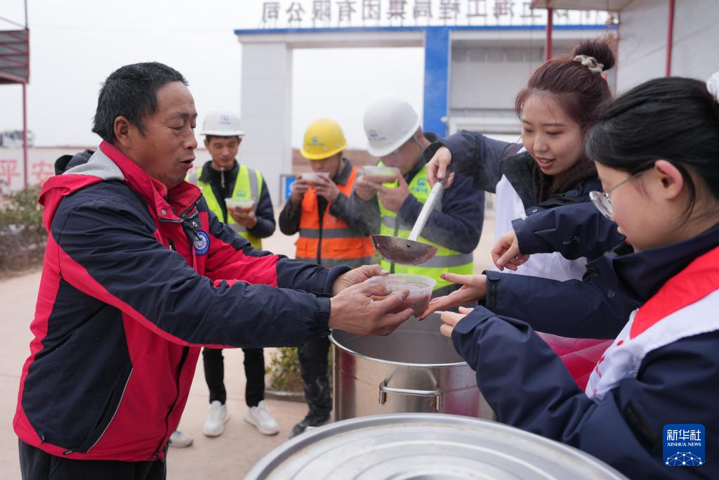 1月24日,在浙江金华铁路枢纽扩容改造工程3标项目部一工区产业工人社区,中铁上海工程局工作人员为工友盛腊八粥。