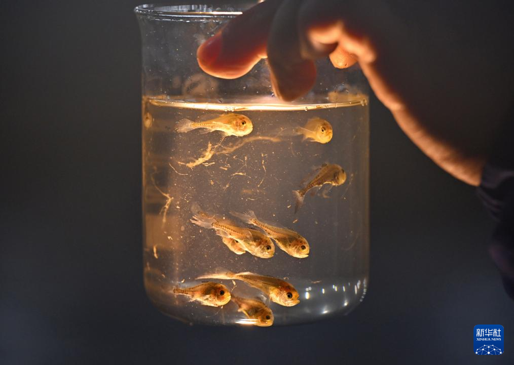1月22日,在福建省宁德市福鼎市沙埕镇一家大黄鱼育苗企业,技术人员查看鱼苗长势。