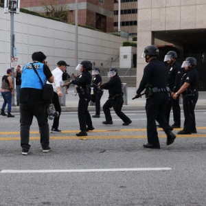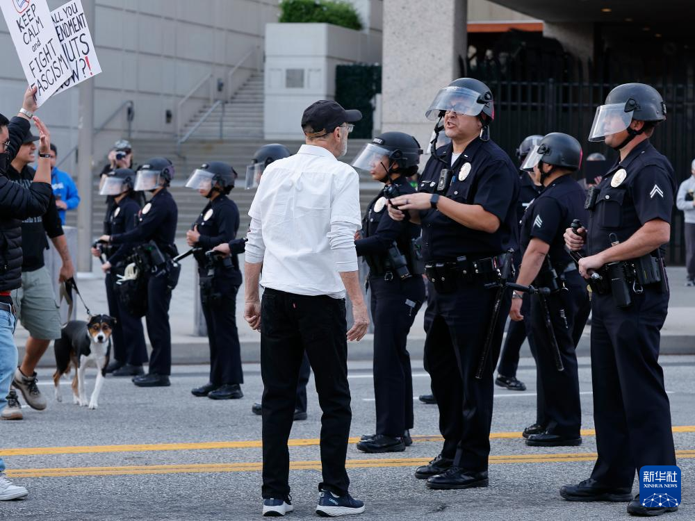 1月25日,在美国加利福尼亚州洛杉矶的大都会拘留中心附近,抗议者与警察对峙。