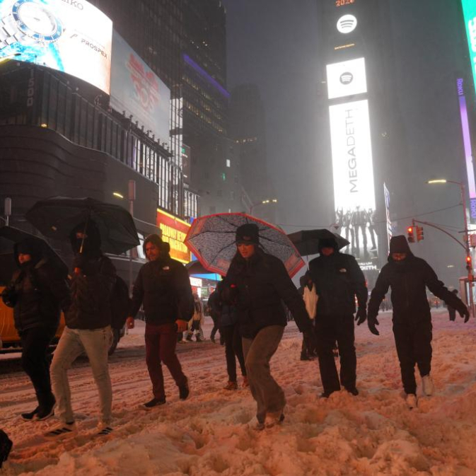 1月25日,在美国纽约时报广场,人们在雪中行走。