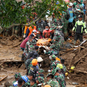 1月26日,在印度尼西亚西爪哇省西万隆县,救援人员在山体滑坡现场运送遇难者遗体。