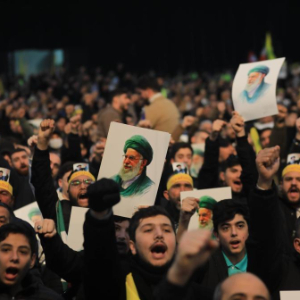 1月26日,在黎巴嫩首都贝鲁特,真主党支持者在集会中高举伊朗最高领袖哈梅内伊的画像并挥舞伊朗国旗,表达对伊朗的支持,并谴责美国的威胁。