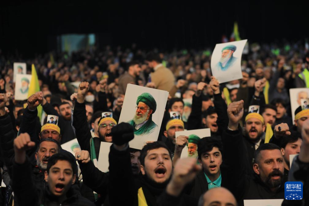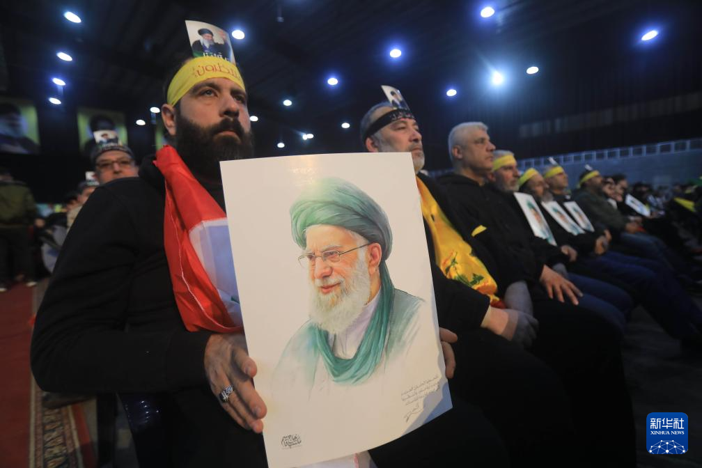 1月26日,在黎巴嫩首都贝鲁特,真主党支持者在集会中高举伊朗最高领袖哈梅内伊的画像,表达对伊朗的支持,并谴责美国的威胁。