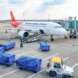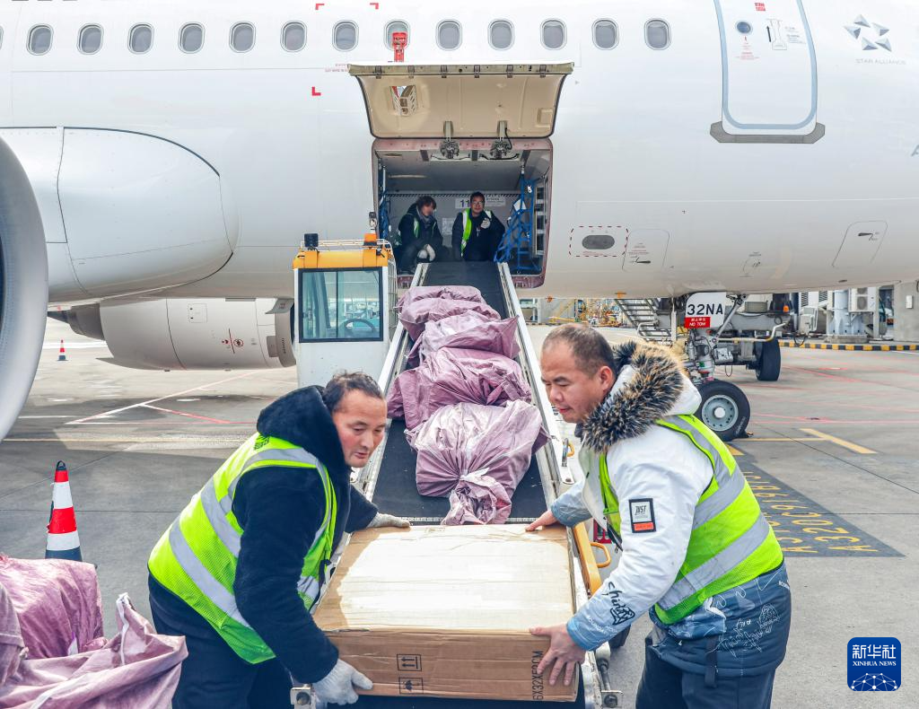 1月28日,装卸人员在扬州泰州国际机场装卸货物。