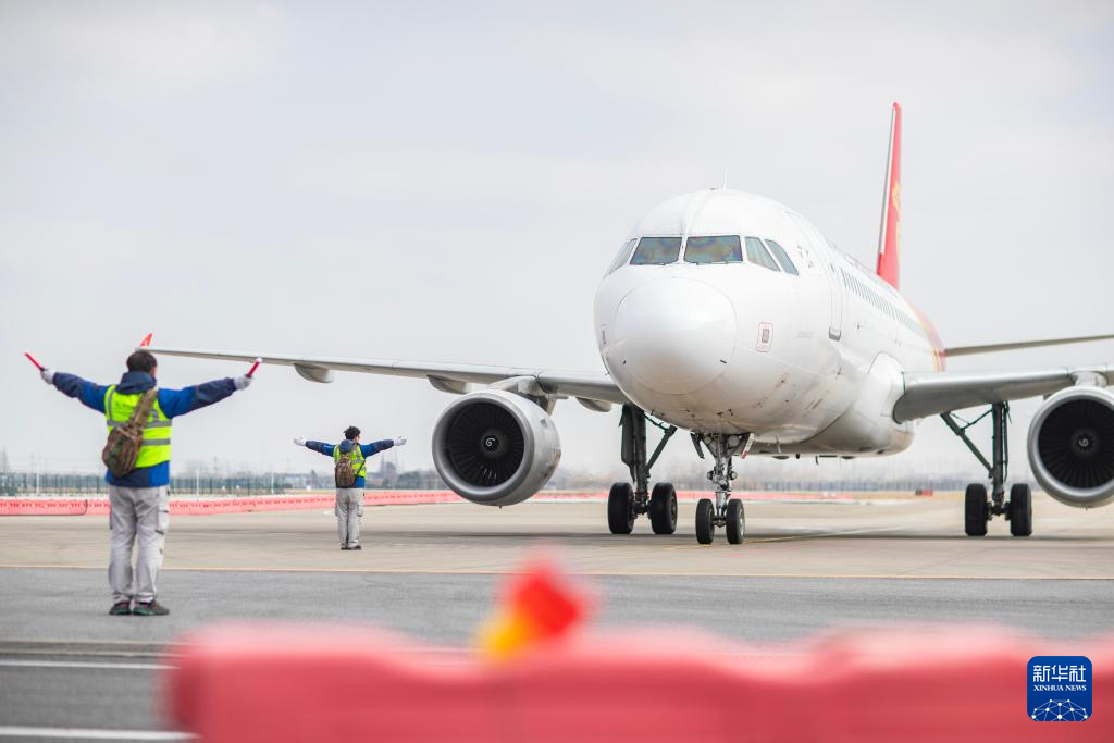 1月28日,机务人员在扬州泰州国际机场停机坪引导飞机停靠到指定停机位。