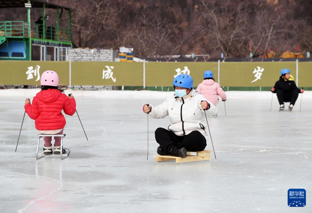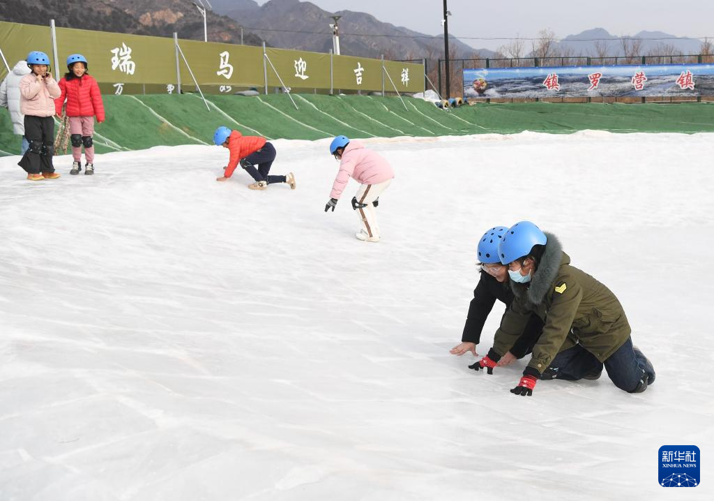 1月28日,在北京市平谷区镇罗营镇湖畔耕读园,游客在活动现场滑冰车。