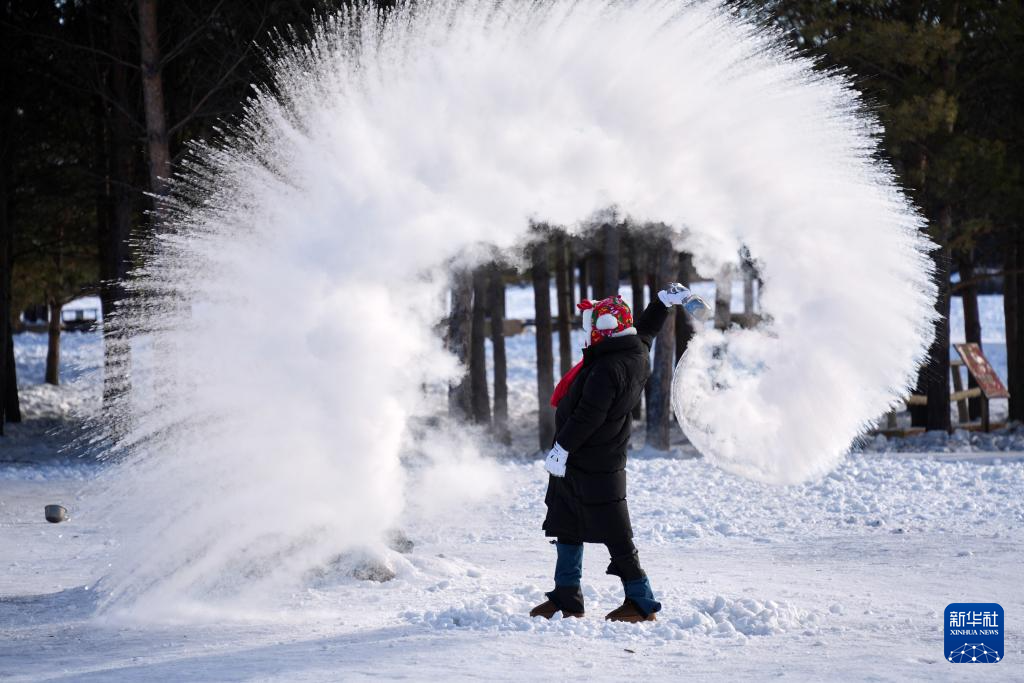 1月29日,在漠河北极村景区内的北极沙洲,游客体验“泼水成冰”。