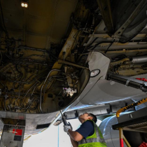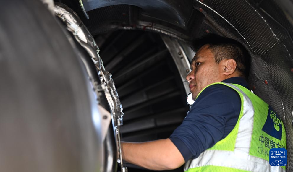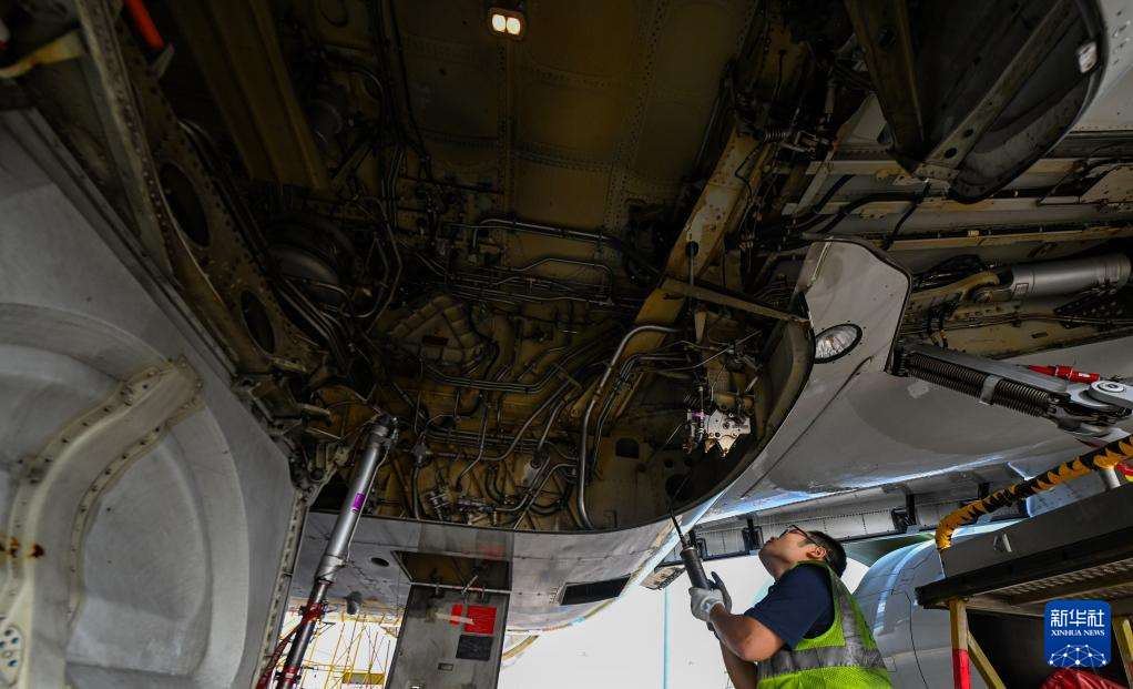 1月29日,海口美兰国际机场停机坪上,南航工程技术分公司机务工程师在对飞机进行深度检查。
