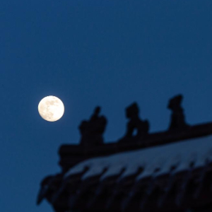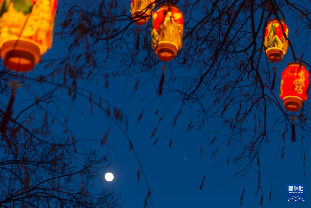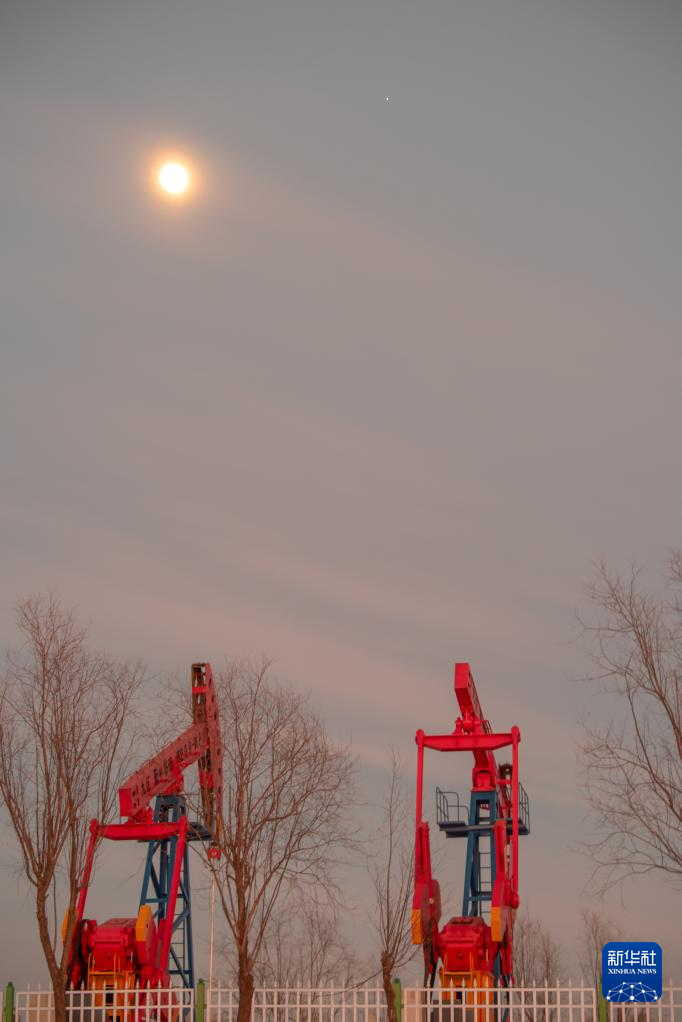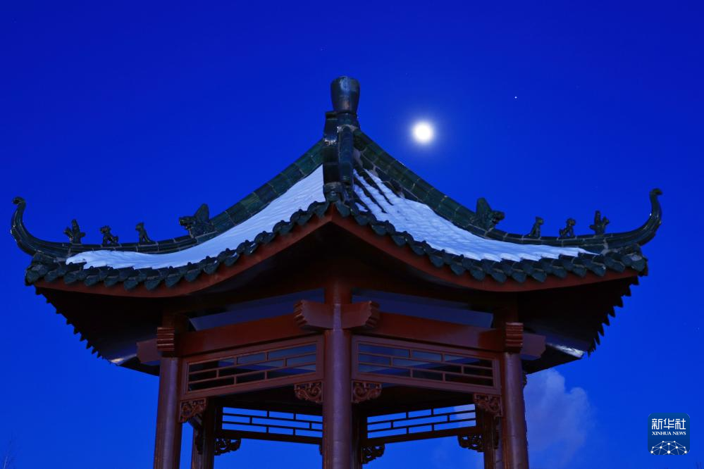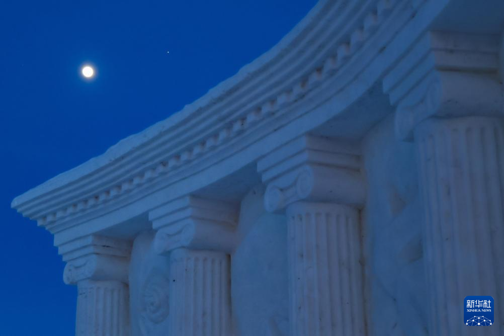 1月31日,在黑龙江省嘉荫县,冰雕与木星伴凸月相映成趣。