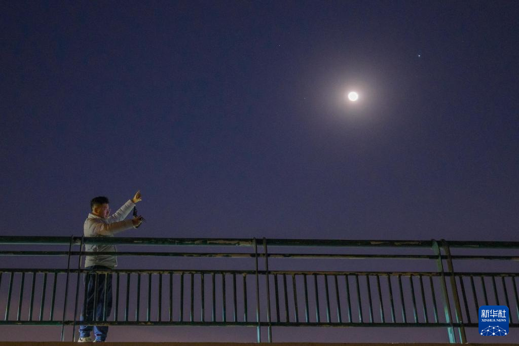 1月31日,摄影爱好者在哈尔滨市拍摄木星伴凸月(无人机照片)。