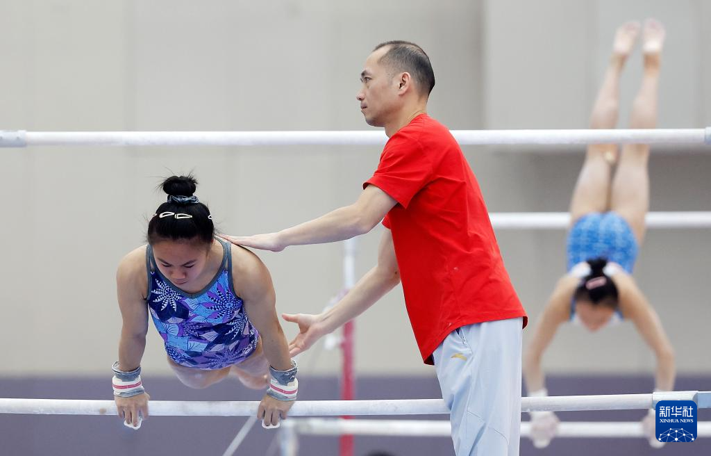 1月31日,教练徐惊雷(中)在平衡木训练中指导选手张清颖(右)。