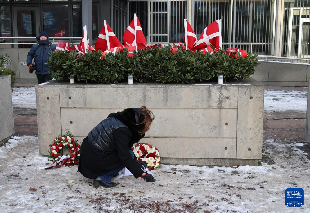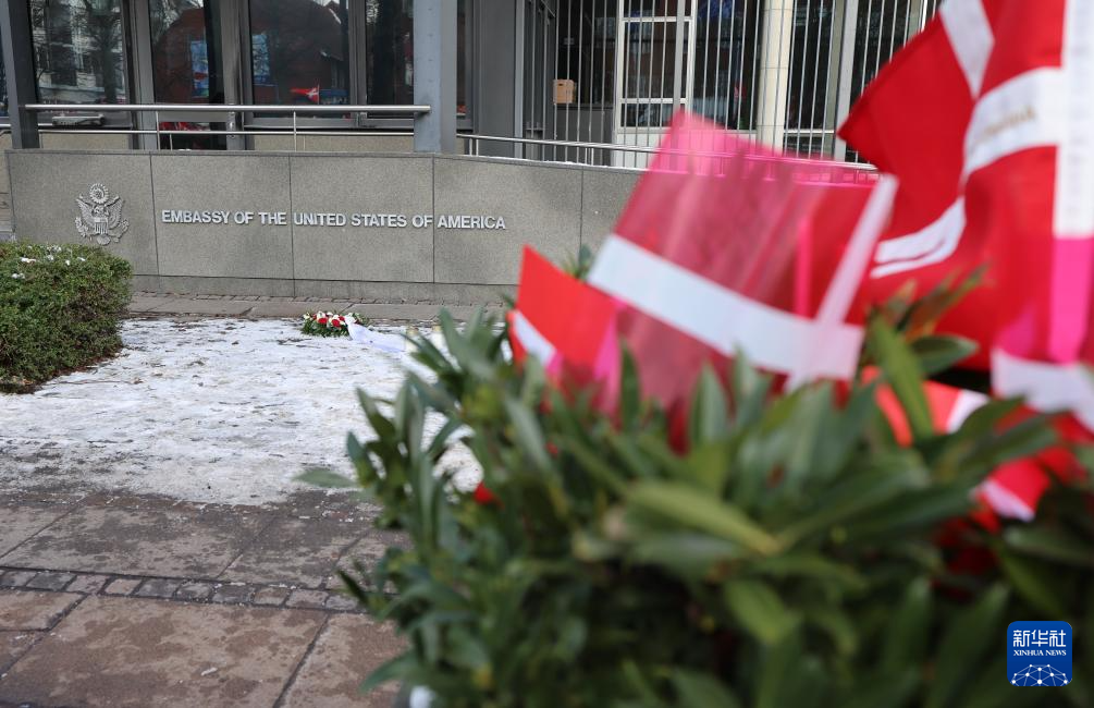 这张1月31日拍摄的照片显示的是位于丹麦首都哥本哈根的美国驻丹麦大使馆门前摆放的丹麦国旗和鲜花。