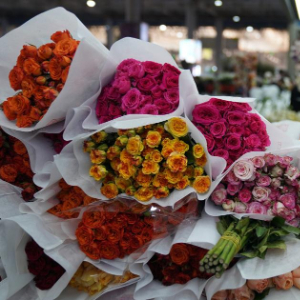 2月1日,商家在昆明的斗南花卉市场内配备鲜花。