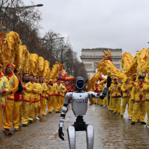 2月1日,在法国首都巴黎的香榭丽舍大街,由宇树科技及其法国代理INNOV8集团提供的机器人在巡游活动上向观众挥手致意。