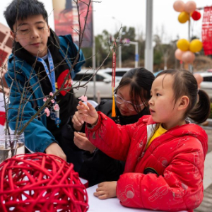 2月3日,在长沙市望城区大泽湖街道金星北路社区,小朋友参与手工梅花制作。