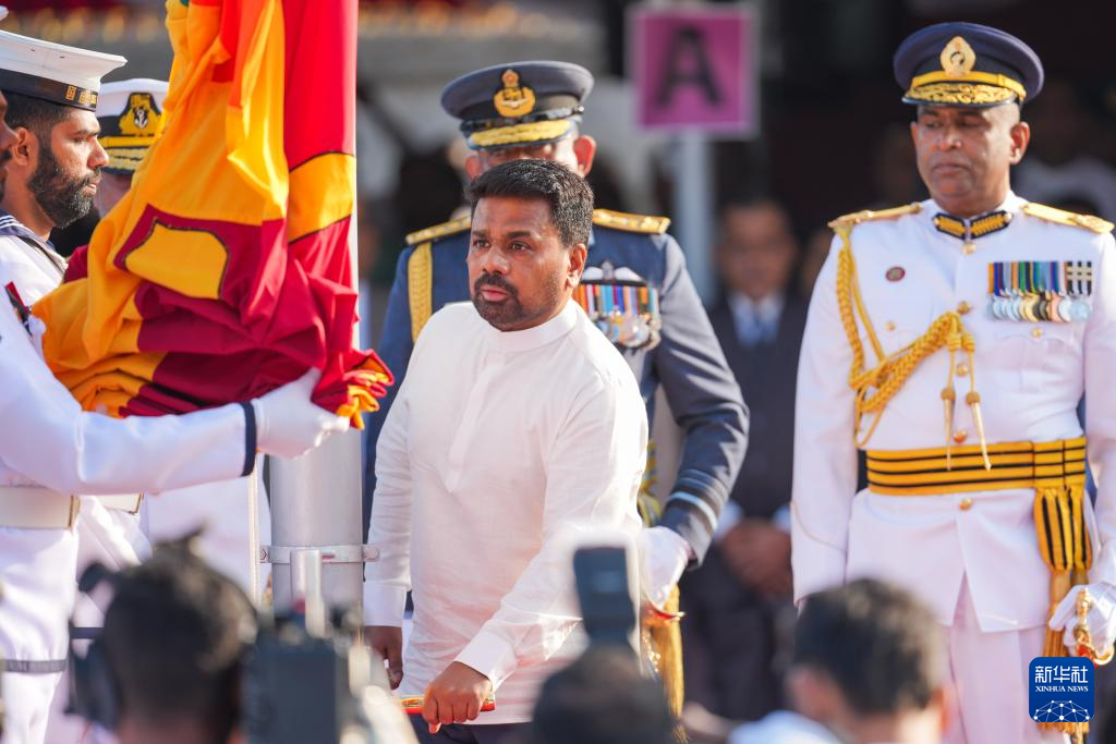 2月4日,在斯里兰卡首都科伦坡,斯里兰卡总统迪萨纳亚克(中)出席独立日庆祝活动。