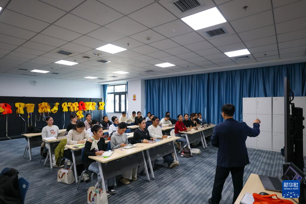 中国民航大学教师迟壮(右)对泰国学生进行客舱安全管理课程授课(1月8日摄)。