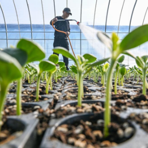 2月4日,在河南省商丘市夏邑县曹集街道一家瓜果育苗基地,村民给瓜苗浇水保墒。