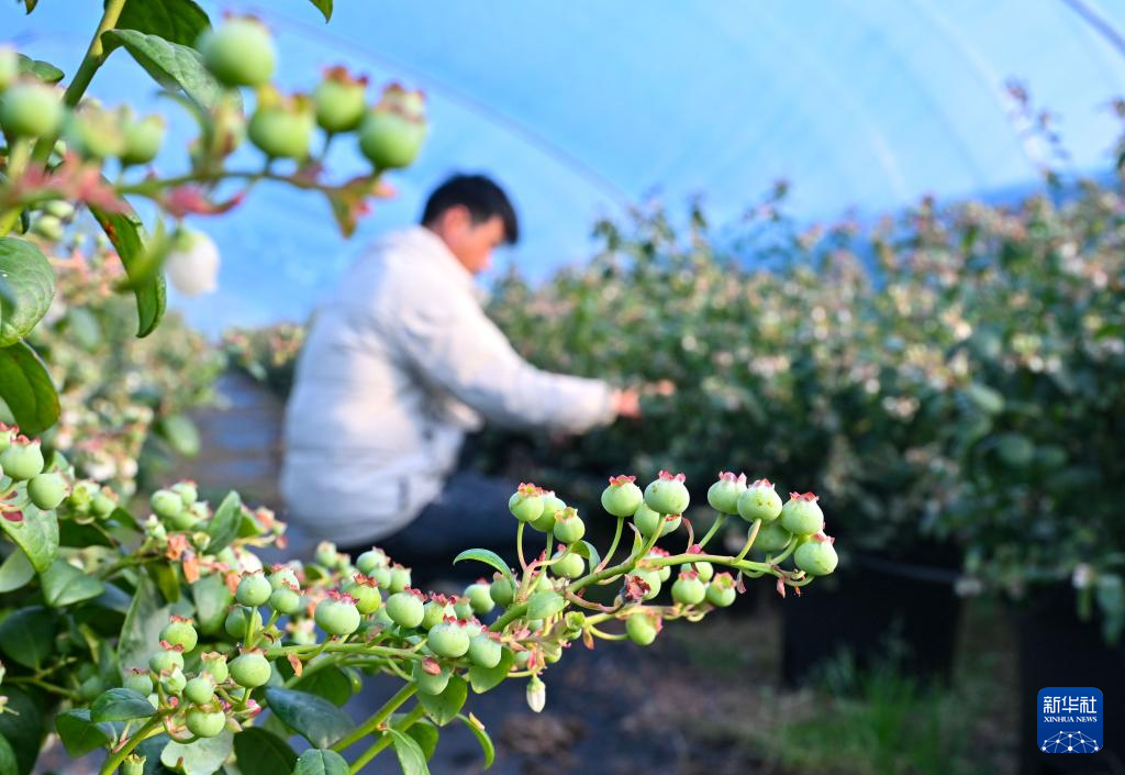 2月4日,在安徽省淮南市田家庵区曹庵镇农博生态园内,农民在管护蓝莓。