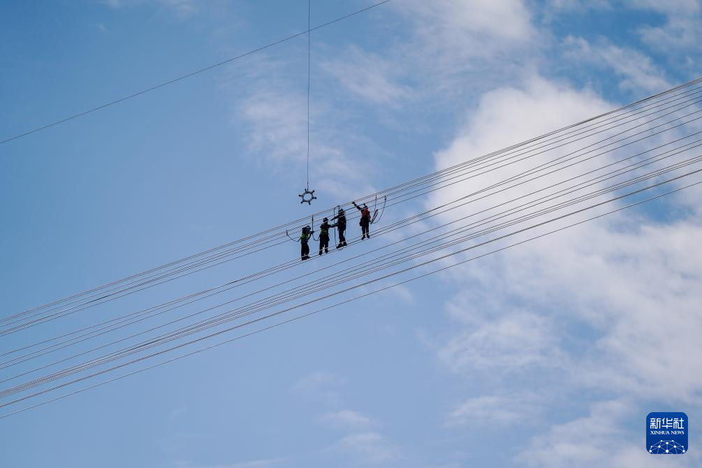 2月5日,施工人员在输电导线跨国连通处作业(无人机照片)。