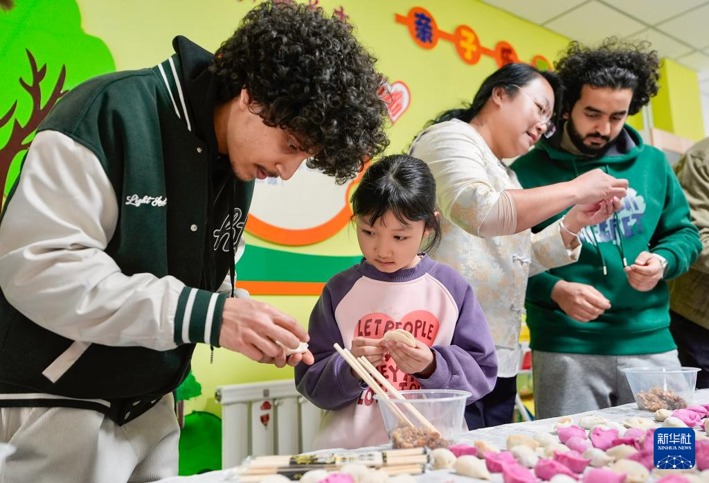 2月5日,北方民族大学国际教育学院的留学生在宁夏银川市西夏区芦花洲社区和当地居民一起包饺子。