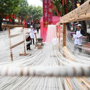 2月6日,工作人员在福州上下杭历史文化街区向市民游客展示福州拉线面技艺。