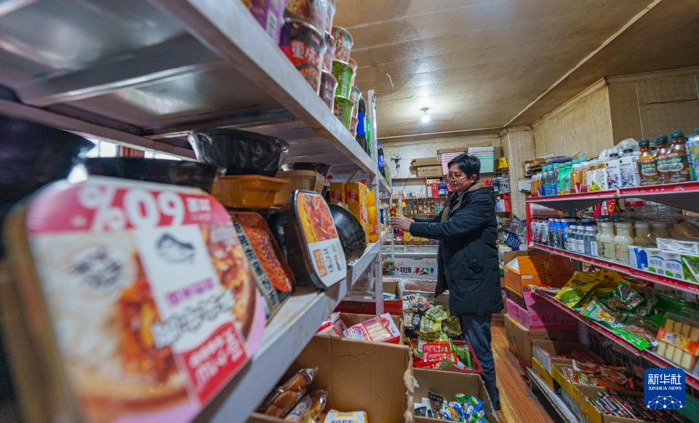 2月5日,玉麦乡一家超市的老板在整理货架。