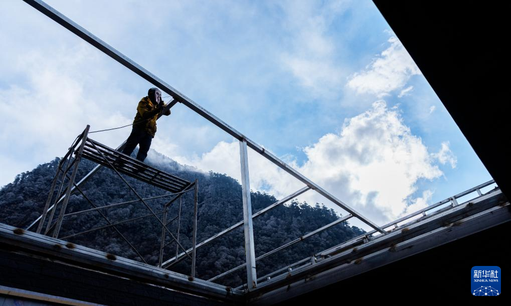 2月5日,玉麦乡村民在焊接民居的天花板钢架。