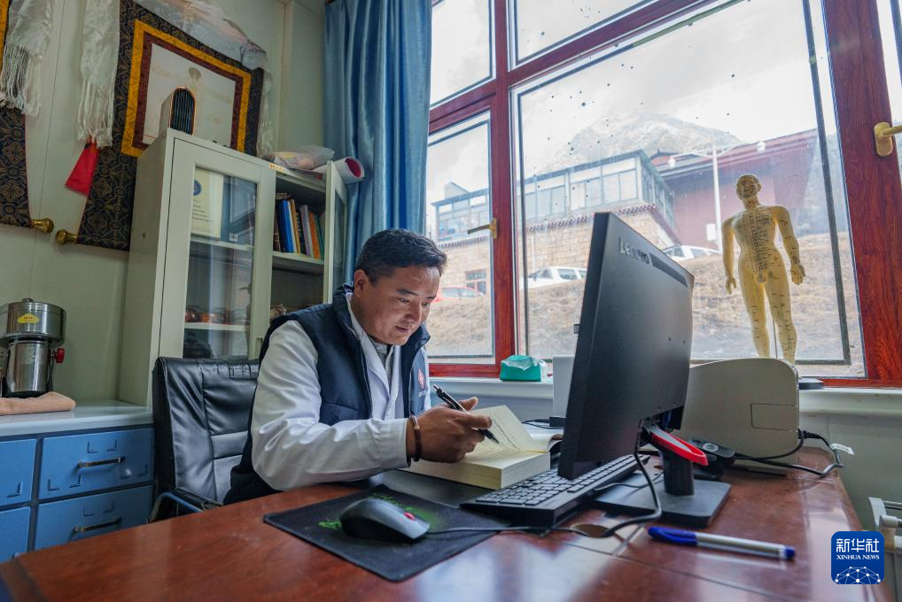 2月5日,玉麦乡卫生院医生次旦米久在办公室研读藏医书籍。