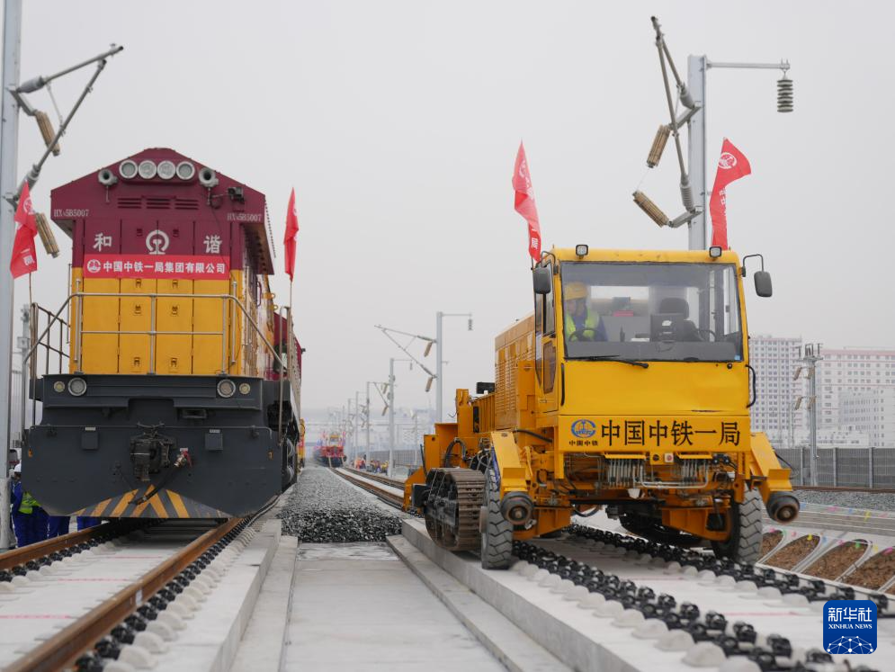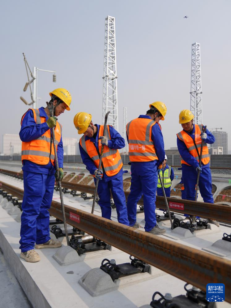 2月6日,中铁一局施工人员在西康高铁安康西站段铺轨现场作业。