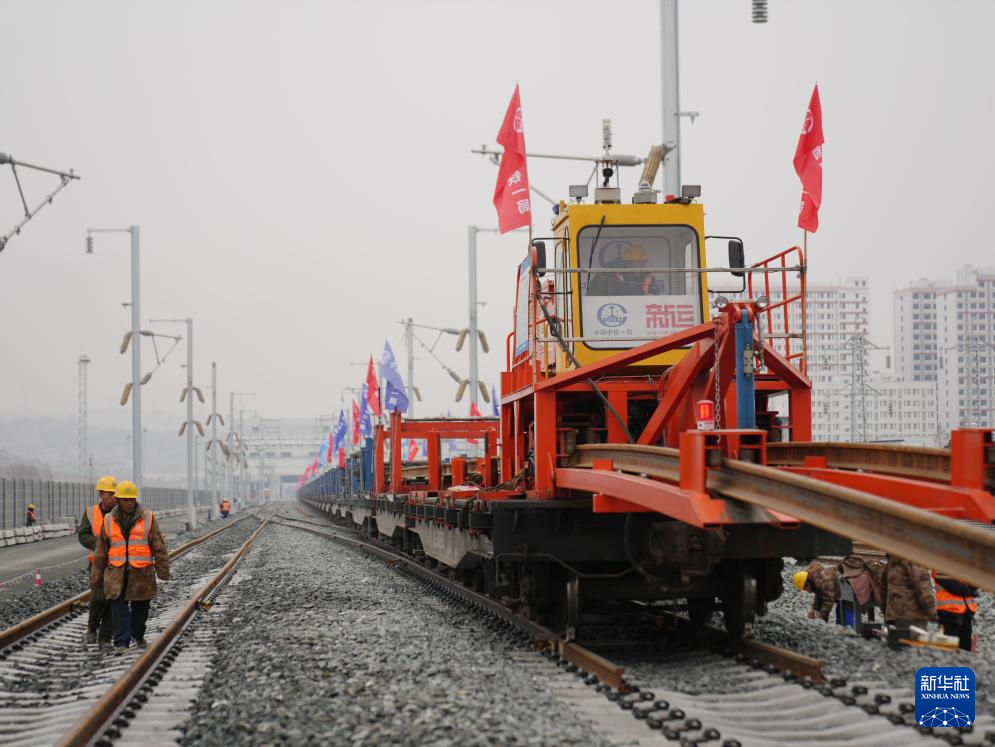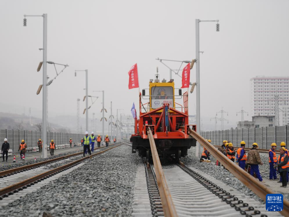 2月6日,中铁一局施工人员操作设备在西康高铁安康西站段铺设无缝钢轨。