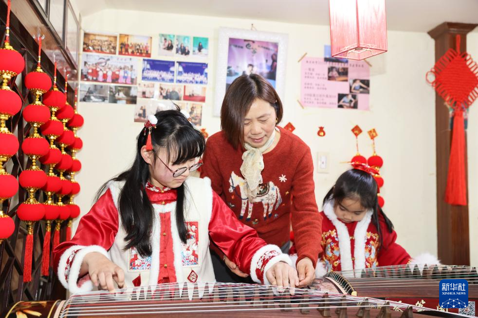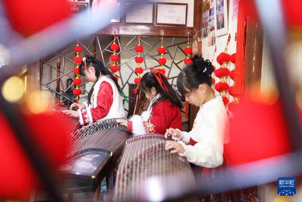2月8日,孩子们在浙江省湖州市德清县乾元镇一家琴行练习弹古筝。