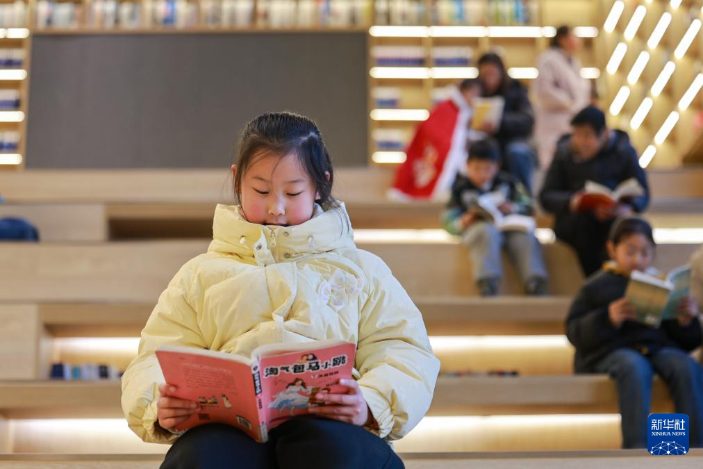 2月8日,江苏省泰兴市新时代文明实践中心羽惠书房内,小朋友在看书。