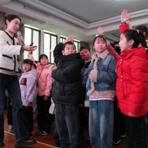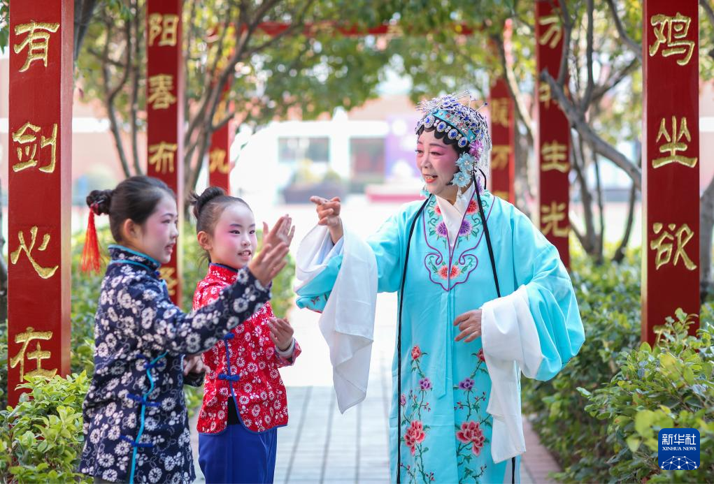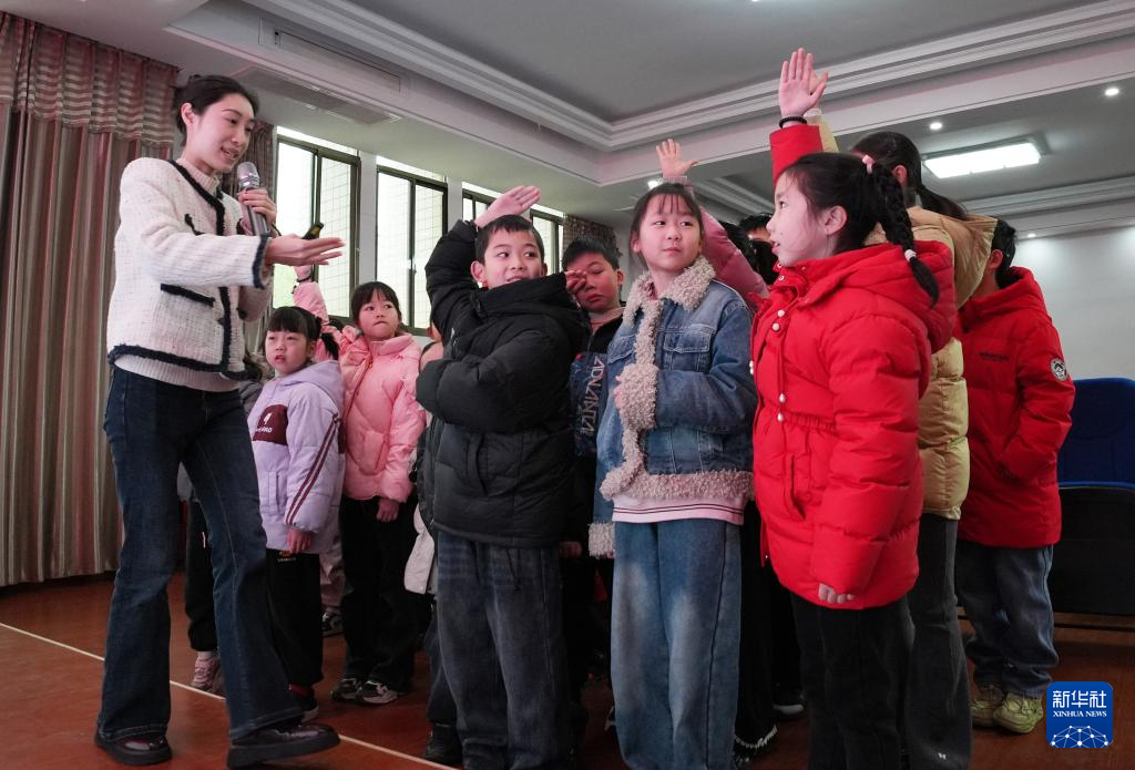 2月8日,在江苏省泰州市姜堰区城西学校教育集团城西小学校区公益寒托班上,戏曲老师指导学生练习戏曲基本动作。