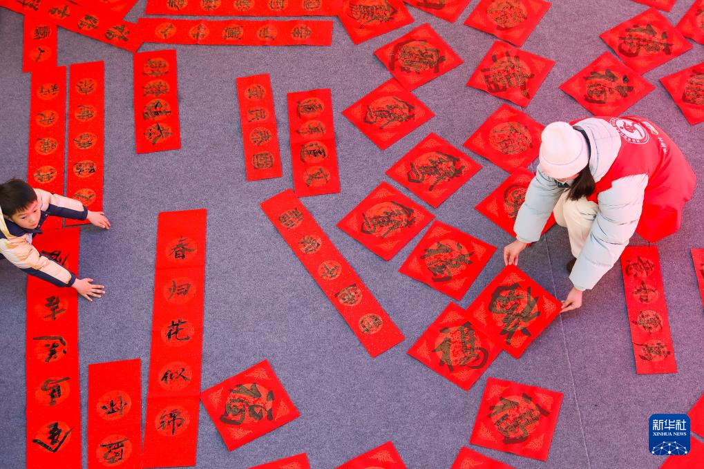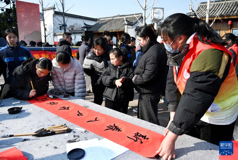 2月8日,学生志愿者(右)在江苏省海安市政协书画联谊会送福字、赠春联文化惠民活动现场整理书法作品。