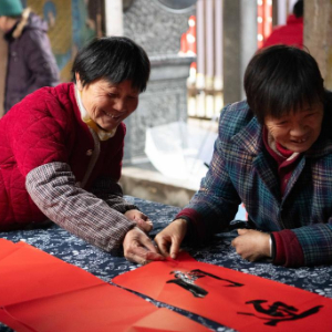 2月6日,在安徽省黄山市黟县南屏村,村民参加写春联活动。